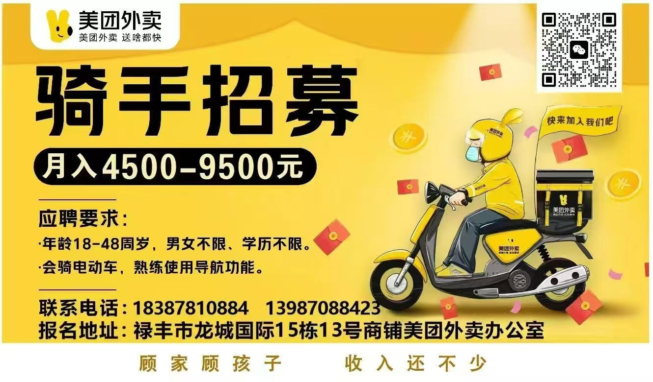 禄丰美团急招送餐员~时间自由 ,多劳多得,上不封顶...